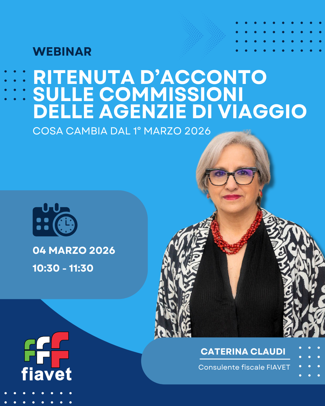 Webinar Fiavet 4 marzo 2026 ore 10:30 dal titolo: "Ritenuta d'acconto sulle commissioni delle agenzie di viaggio: cosa cambia dal 1°marzo 2026"